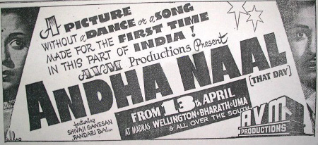 Tak zaczyna się Aandha Naal (Ten dzień) – pierwszy tamilski film noir, a w dodatku pierwszy w tej kinematografii obraz dźwiękowy zrealizowany bez piosenek, znacznie krótszy w dodatku niż dyktował ówczesny standard. Pozbawiony był również sekwencji kaskaderskich. Zatem – wszystkiego, co przyciągało masową publiczność przed ekrany. Szkoda, że ponad półwiecze później w kinie komercyjnym nie znajdziemy zbyt wielu odważnych prób wyłamywania się ze schematów.